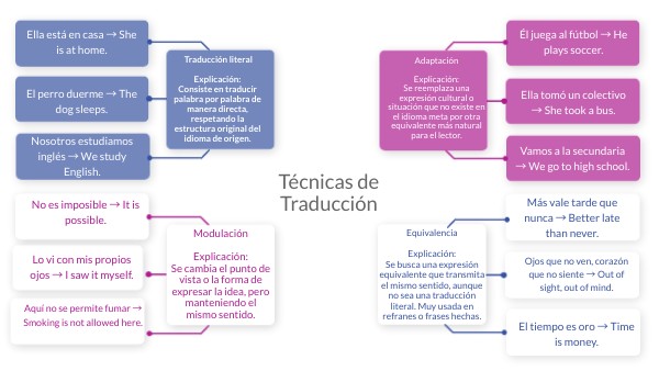 Traducción literal Explicación: Consiste en traducir palabra por palabra de manera directa, respetando la estructura original del idioma de origen.