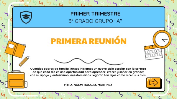 Queridos padres de familia, juntos iniciamos un nuevo ciclo escolar con la certeza de que cada día es una oportunidad para aprender, crecer y soñar en grande; con su apoyo y entusiasmo, nuestros niños llegarán tan lejos como alcen sus alas. MTRA. NOEMI ROSALES MARTINEZ