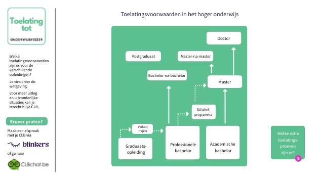 Welke toelatingsvoorwaardenzijn er voor de verschillende opleidingen? Je vindt hier de wetgeving. Voor meer uitleg en uitzonderlijke situaties kan je terecht bij je CLB.