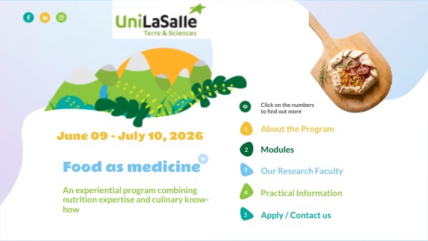"Food as Medicine" is a transformative journey at the heart of UniLaSalle's research expertise. Imagine exploring the profound impact of cuisine on adults with chronic conditions and being part of something truly life-changing. This program combines culinary workshops, enlightening lectures, and inspiring field visits that will showcase the remarkable power of food to change lives. Don't miss out on this incredible opportunity to foster growth and opportunity. UniLaSalle is located on a secure 10-acre campus just North of Beauvais, a charming town only 80 minutes by train from Paris.