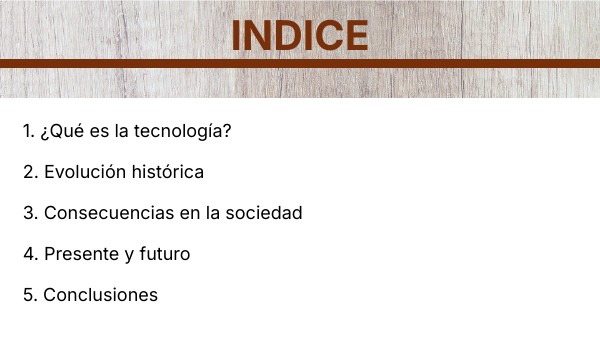 1. ¿Qué es la tecnología? 2. Evolución histórica 3. Consecuencias en la sociedad 4. Presente y futuro 5. Conclusiones
