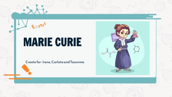 She married Pierre Curie, from whom she adopted her surname, and together she carried out her research on radioactive sustances, whichled to the discovery of two new elements in the periodic table: radium and polonium, both more radioactive than uranium. This discovery earned. them the Nobel Price.