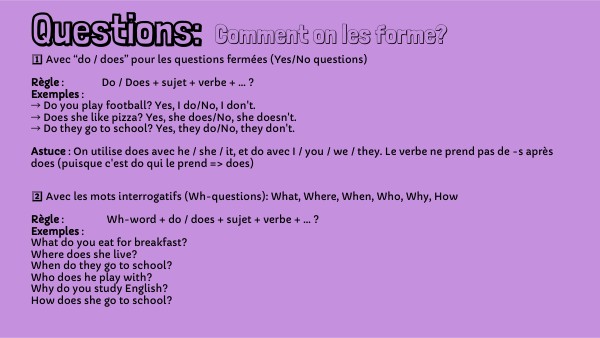1️⃣ Avec “do / does” pour les questions fermées (Yes/No questions) Règle : Do / Does + sujet + verbe + … ? Exemples : → Do you play football? Yes, I do/No, I don't. → Does she like pizza? Yes, she does/No, she doesn't. → Do they go to school? Yes, they do/No, they don't. Astuce : On utilise does avec he / she / it, et do avec I / you / we / they. Le verbe ne prend pas de -s après does (puisque c'est do qui le prend => does)
