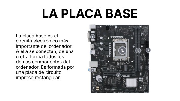 La placa base es el circuito electrónico más importante del ordenador. A ella se conectan, de una u otra forma todos los demás componentes del ordenador. Es formada por una placa de circuito impreso rectangular.