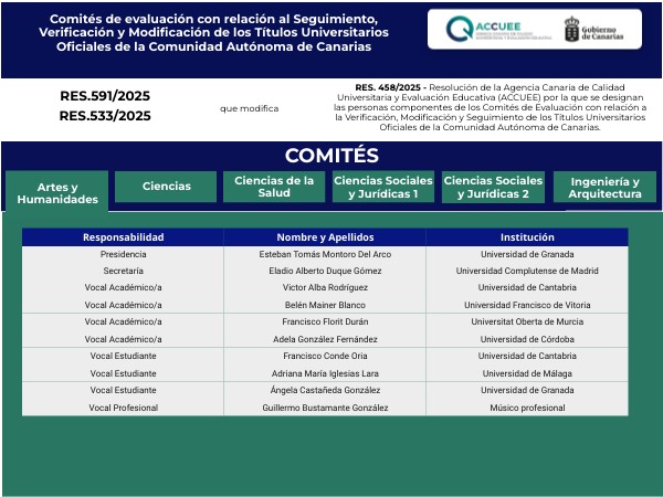 RES. 458/2025 - Resolución de la Agencia Canaria de Calidad Universitaria y Evaluación Educativa (ACCUEE) por la que se designan las personas componentes de los Comités de Evaluación con relación a la Verificación, Modificación y Seguimiento de los Títulos Universitarios Oficiales de la Comunidad Autónoma de Canarias.