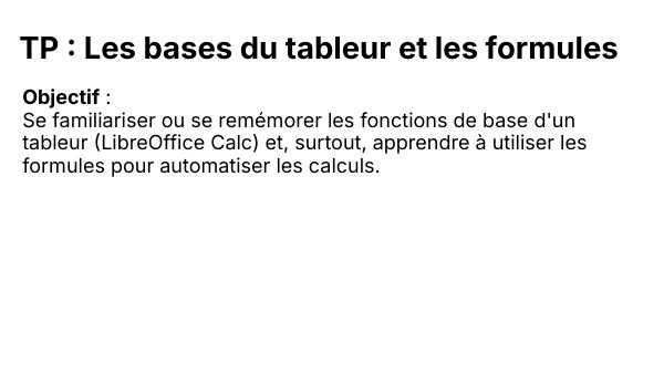 Objectif : Se familiariser ou se remémorer les fonctions de base d'un tableur (LibreOffice Calc) et, surtout, apprendre à utiliser les formules pour automatiser les calculs.