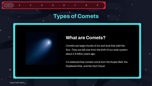 Comets are large chunks of ice and dust that orbit the Sun. They are left over from the birth of our solar system about 4.6 billion years ago. It is believed that comets come from the Kuiper Belt, the Scattered Disk, and the Oort Cloud.