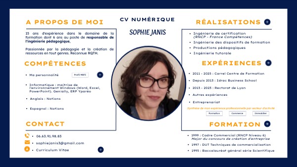 15 ans d'expérience dans le domaine de la formation dont 6 ans au poste de responsable de l'ingénierie pédagogique, Passionnée par la pédagogie et la création de ressources en tout genres. Reconnue RQTH.