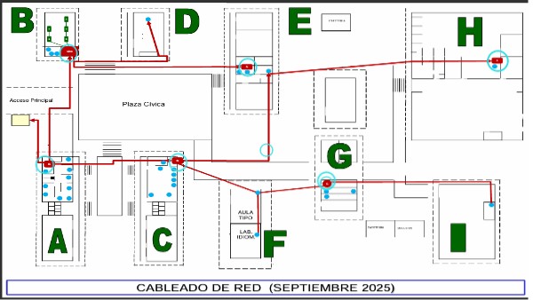 En el laboratorio (B) es donde estan los dos modem (Telmex y Gbic) y de ahi se conecta a un swich que envia señal de internet a la oficina de la direccion por medio de cables supterranios.Telmex:Este internet lo tienen especialmente por la linea telefonica, tiene un ruteador que permite ampliar una red. Gcbi:Se conectan hasta casi 250 computadoras tiene un ruteador omado, tiene una funcion especial que puede dar hasta 1000 conexiones.