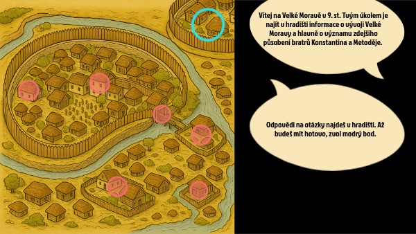 Vítej na Velké Moravě v 9. st. Tvým úkolem je najít v hradišti informace o vývoji Velké Moravy a hlavně o významu zdejšího působení bratrů Konstantina a Metoděje.