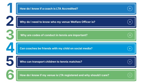 It’s important to know your Welfare Officer because any safeguarding concerns can be reported to them directly an they are trained to manage that information. Details of your venue Welfare Officer will be found in your venue’s safeguarding policy, online and on posters around the venue. They can also help you with advice around how the club keeps children safe. If you cannot find your venue welfare officer details please contact the LTA safeguarding team at safeguarding@lta.org.uk.