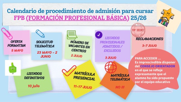 Calendario de procedimiento de admisión para cursar FPB (FORMACIÓN PROFESIONAL BÁSICA) 25/26