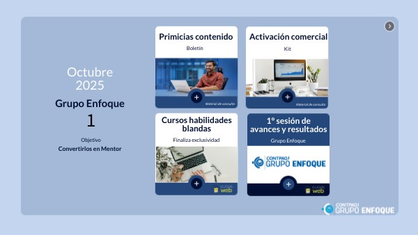 Presentar las acciones realizadas durante el trimestre de julio, agosto y septiembre, compartiendo los resultados obtenidos en las sesiones previas con el Grupo Enfoque. Además, se establecerá la planeación para el último trimestre del año, con el fin de fortalecer el trabajo colaborativo, alinear expectativas y asegurar el cumplimiento de metas conjuntas. Fecha: 22 de octubre de 2025 Sesión: 1 sesión Duración: 1 hora Horario: 11am a 12pm (TCM) Inscríbete aquí