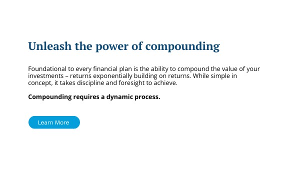 Foundational to every financial plan is the ability to compound the value of your investments – returns exponentially building on returns. While simple in concept, it takes discipline and foresight to achieve. Compounding requires a dynamic process.