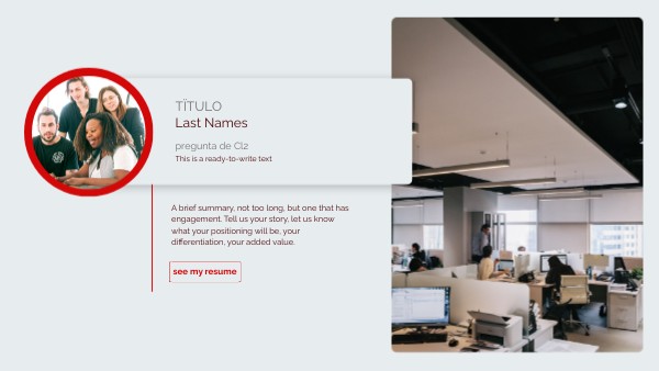 A brief summary, not too long, but one that has engagement. Tell us your story, let us know what your positioning will be, your differentiation, your added value.
