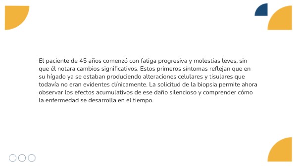 Al analizar la biopsia, se observa que los hepatocitos presentan acumulación de grasa y áreas de necrosis, mostrando que la respuesta inicial de adaptación celular no fue suficiente para proteger al órgano. Estos cambios explican la alteración funcional del hígado que se refleja en las transaminasas elevadas y la bilirrubina alta del paciente.