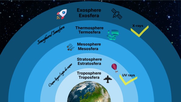 - At 25km from the Earth we find the OZONE LAYER that absorbs UV rays.// A 25km de la Tierra encontramos la CAPA DE OZONO que absorbe los rayos UV.