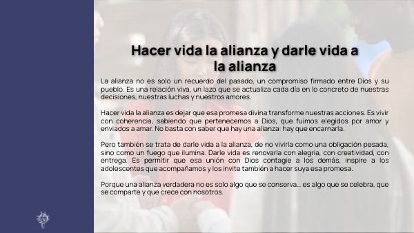 La alianza con el ECYD no es solo un compromiso externo, sino un vínculo profundo de amor con Cristo, que nos invita a caminar con Él y a ser apóstoles en el mundo. Es decirle “sí” al Señor desde la juventud, con alegría y libertad, respondiendo con generosidad al llamado a amar y servir a los demás. Esta alianza es un espacio de crecimiento, de comunidad, de formación y de misión. Es un recordatorio de que no estamos solos en nuestro camino de fe, sino que somos parte de una familia espiritual que camina unida, sosteniéndose en oración, acompañándose en las luchas y alegrías, y apoyándose para ser mejores cada día. Firmar esta alianza es confiarle nuestra vida a Cristo y permitirle que nos transforme para ser luz en medio de nuestro entorno. Nos impulsa a vivir con coherencia, a dejar huella y a ser discípulos y misioneros en cada espacio donde estemos, compartiendo el amor de Dios con el mundo.