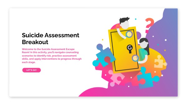 Welcome to the Suicide Assessment Escape Room! In this activity, you’ll navigate counseling scenarios to identify risk, practice assessment skills, and apply interventions to progress through each stage.