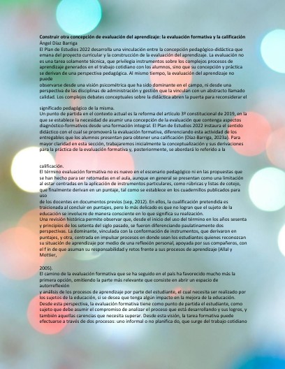 significado pedagógico de la misma. Un punto de partida en el contexto actual es la reforma del artículo 3º constitucional de 2019, en la que se establece la necesidad de asumir una concepción de la evaluación que contenga aspectos diagnóstico-formativos desde una formación integral. El Plan de Estudios 2022 instaura el sentido didáctico con el cual se promoverá la evaluación formativa, diferenciando esta actividad de los entregables que los alumnos presentan para obtener una calificación (Díaz-Barriga, 2023a). Para mayor claridad en esta sección, trabajaremos inicialmente la conceptualización y sus derivaciones para la práctica de la evaluación formativa y, posteriormente, se abordará lo referido a la