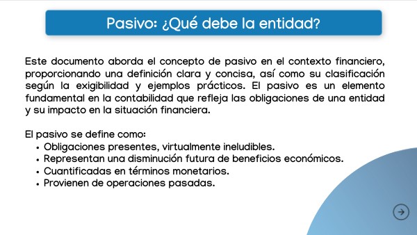 Este documento presenta una visión general del concepto de capital contable, específicamente en el contexto de organizaciones no lucrativas. Se define el capital contable según la normativa vigente y se clasifica en sus diferentes componentes, además de proporcionar ejemplos concretos que ilustran su aplicación. El capital contable se define como el valor residual de los activos después de deducir los pasivos. Este valor representa la participación de los socios, accionistas o propietarios en la entidad, reflejando su inversión y el rendimiento acumulado a lo largo del tiempo.