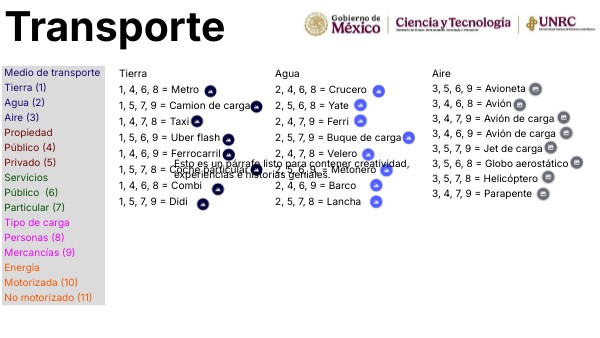 Medio de transporte Tierra (1) Agua (2) Aire (3) Propiedad Público (4) Privado (5) Servicios Público (6) Particular (7) Tipo de carga Personas (8) Mercancías (9) Energia Motorizada (10) No motorizado (11)