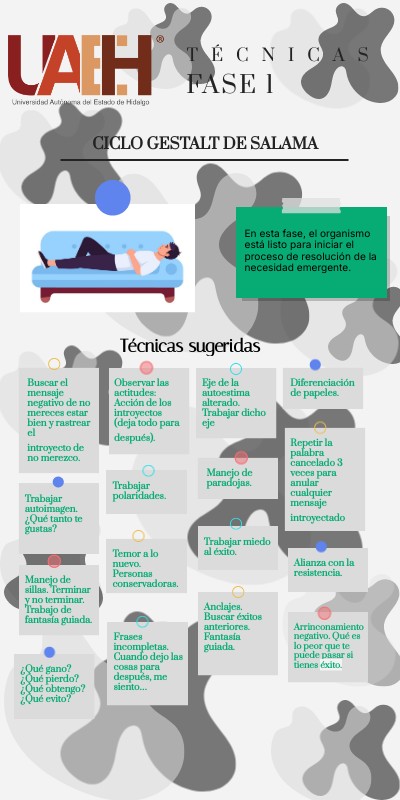En una silla, el paciente se sienta como “el que siempre deja inconcluso” y en otra como “el que quiere terminar”. Se dialoga entre ambas partes y luego se hace una fantasía guiada donde imagina.