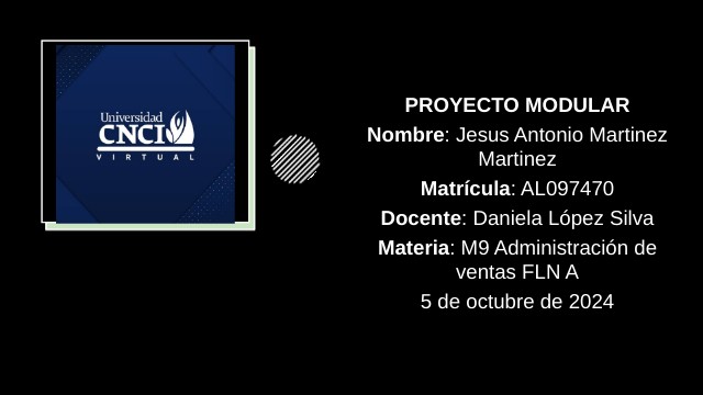 PROYECTO MODULAR Nombre: Jesus Antonio Martinez Martinez Matrícula: AL097470 Docente: Daniela López Silva Materia: M9 Administración de ventas FLN A 5 de octubre de 2024