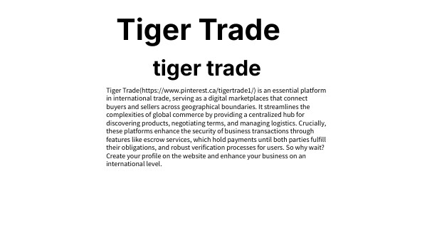 Tiger Trade(https://www.pinterest.ca/tigertrade1/) is an essential platform in international trade, serving as a digital marketplaces that connect buyers and sellers across geographical boundaries. It streamlines the complexities of global commerce by providing a centralized hub for discovering products, negotiating terms, and managing logistics. Crucially, these platforms enhance the security of business transactions through features like escrow services, which hold payments until both parties fulfill their obligations, and robust verification processes for users. So why wait? Create your profile on the website and enhance your business on an international level.