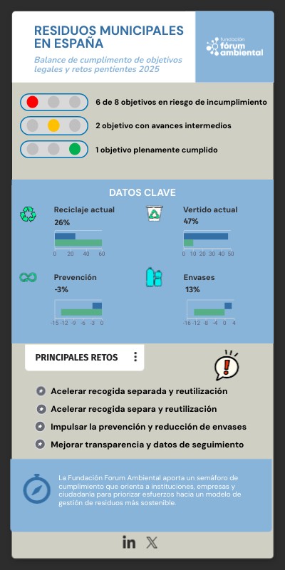 La Fundación Forum Ambiental aporta un semáforo de cumplimiento que orienta a instituciones, empresas y ciudadanía para priorizar esfuerzos hacia un modelo de gestión de residuos más sostenible.