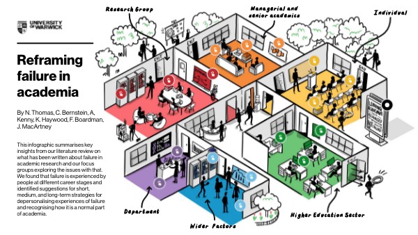 This infographic summarises key insights from our literature review on what has been written about failure in academic research and our focus groups exploring the issues with that. We found that failure is experienced by people at different career stages and identified suggestions for short, medium, and long-term strategies for depersonalising experiences of failure and recognising how it is a normal part of academia.