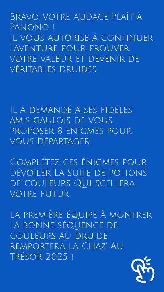 Il a demandé à ses fidèles amis gaulois de vous proposer 8 énigmes pour vous départager. Complétez ces énigmes pour dévoiler La suite de potions de couleurs QUI scellera votre futur. La première équipe à montrer la bonne séquence de couleurs au druide remportera la Chaz' Au Trésor 2025 !