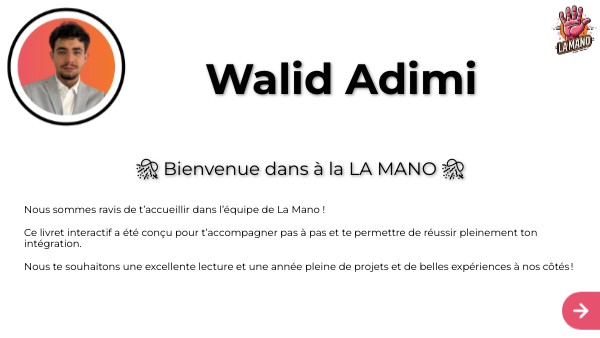 Nous sommes ravis de t’accueillir dans l’équipe de La Mano ! Ce livret interactif a été conçu pour t’accompagner pas à pas et te permettre de réussir pleinement ton intégration. Nous te souhaitons une excellente lecture et une année pleine de projets et de belles expériences à nos côtés !