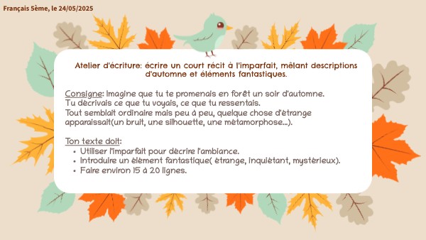 Atelier d'écriture: écrire un court récit à l'imparfait, mêlant descriptions d'automne et éléments fantastiques.