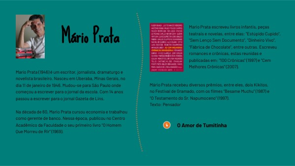Mario Prata (1946) é um escritor, jornalista, dramaturgo e novelista brasileiro. Nasceu em Uberaba, Minas Gerais, no dia 11 de janeiro de 1946. Mudou-se para São Paulo onde começou a escrever para o jornal da escola. Com 14 anos passou a escrever para o jornal Gazeta de Lins. Na década de 60, Mario Prata cursou economia e trabalhou como gerente de banco. Nessa época, publicou no Centro Acadêmico da Faculdade o seu primeiro livro “O Homem Que Morreu de Rir” (1969).