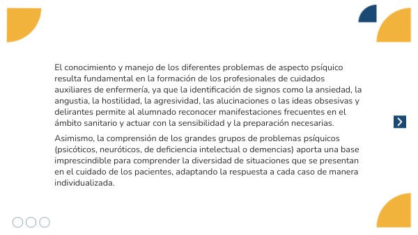 Laura recuerda que es muy importante observar con atención al paciente. En este caso, el residente inquieto muestra claros signos de ansiedad, mientras que la mujer que afirma escuchar voces refleja un episodio de alucinación. El aislamiento del otro paciente le hace pensar en una angustia profunda, y las palabras del que habla de acabar con su vida evidencian ideas suicidas. Frente al residente hostil y agresivo, Laura aprende a mantener la calma y a identificar que también se trata de un signo que requiere atención inmediata. Reconocer cada uno de estos comportamientos es el primer paso para poder actuar correctamente.
