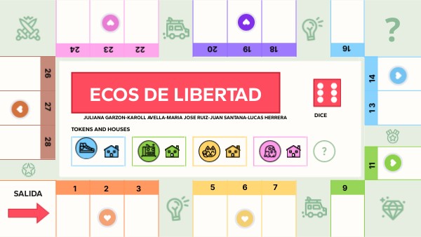 Each player must choose a color: blue, green, yellow, or pink. This gives them a token to mark their position and 10 houses to indicate the properties they acquire throughout the game. Each player must take their colored token and place it on the starting space. To start playing, click on the dice and move your token to the corresponding space. On each space, there must be one or more questions. If you answer correctly, place one of your houses on that space. Congratulations, you have acquired a new property! Special spaces: spaces with icons may contain penalties such as "The player pays light taxes: loses 2 houses". Answer the question correctly to avoid the penalty! The player who has the most houses on the board once all spaces are occupied will win.