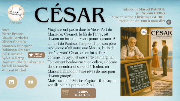 Adapté de Marcel PAGNOL par Sylvain HERRYMise en scène Christine GAUDRU Production du Tant à nous dire