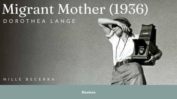 Argazkilaritza dokumentala historiaren eta bere krisien isla indartsua izan daiteke. Estatu Batuetako Depresio Handiaren gaian, Dorothea Lange-ren lanak pobrezia eta sufrimenduari aurpegia emateagatik nabarmendu zen. Atera zituen irudi guztien artean, Migrant Mother (1936) sinbolo ezagunena bihurtu zen.Aurkezpen honen zehar, Depresio Handiari buruz, eta Langek jokatutako paperari buruz hitz egingo dut. Eta baita, emakume argazkilaria izateagatik eduki zituen zailtasunetaz.