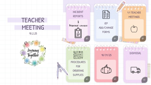 - How do you communicate expectations to your TA's and 1:1's (eg: Weekly Team Meeting, Written - binder, charts, lunch schedules, etc)?