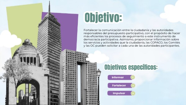 Fortalecer la comunicación entre la ciudadanía y las autoridades responsables del presupuesto participativo, con el propósito de hacer más eficientes los procesos de seguimiento a este instrumento de democracia participativa. Asimismo, proporcionar información sobre los servicios y actividades que la ciudadanía, las COPACO, los Comités y las OC pueden solicitar a cada una de las autoridades participantes.