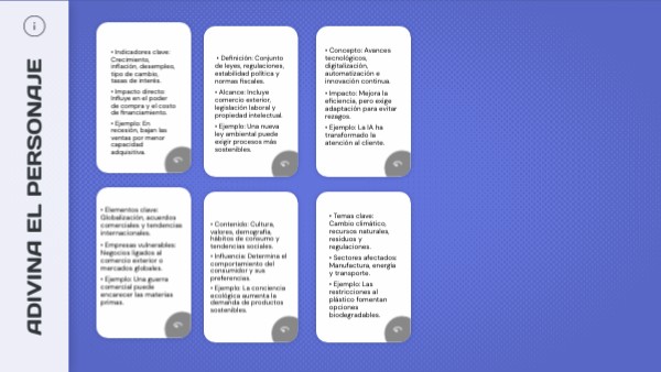 • Impacto: Mejora la eficiencia, pero exige adaptación para evitar rezagos. • Ejemplo: La IA ha transformado la atención al cliente.• Indicadores clave: Crecimiento, inflación, desempleo, tipo de cambio, tasas de interés. • Impacto directo: Influye en el poder de compra y el costo de financiamiento. • Ejemplo: En recesión, bajan las ventas por menor capacidad adquisitiva.