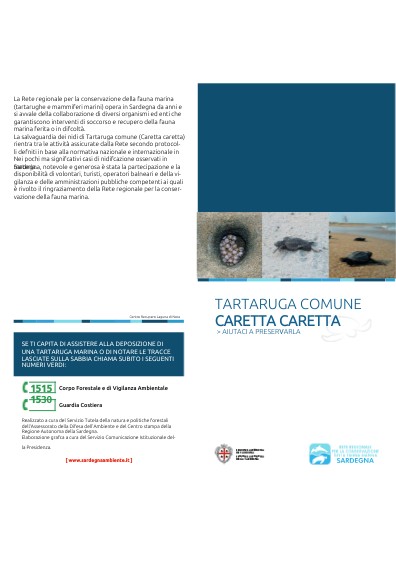 La Rete regionale per la conservazione della fauna marina (tartarughe e mammiferi marini) opera in Sardegna da anni e si avvale della collaborazione di diversi organismi ed enti che garantiscono interventi di soccorso e recupero della fauna marina ferita o in difcoltà.La salvaguardia dei nidi di Tartaruga comune (Caretta caretta) rientra tra le attività assicurate dalla Rete secondo protocol-li defniti in base alla normativa nazionale e internazionale in Nei pochi ma signifcativi casi di nidifcazione osservati in Sardegna, notevole e generosa è stata la partecipazione e la disponibilità di volontari, turisti, operatori balneari e della vi-gilanza e delle amministrazioni pubbliche competenti ai quali è rivolto il ringraziamento della Rete regionale per la conser-vazione della fauna marina.