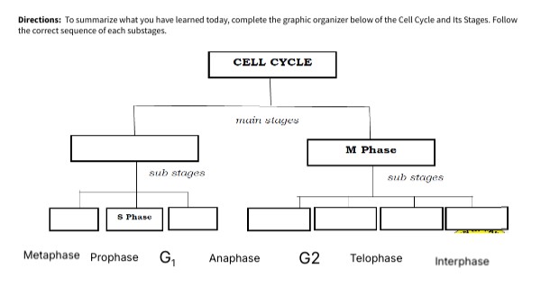 Directions: To summarize what you have learned today, complete the graphic organizer below of the Cell Cycle and Its Stages. Follow the correct sequence of each substages.