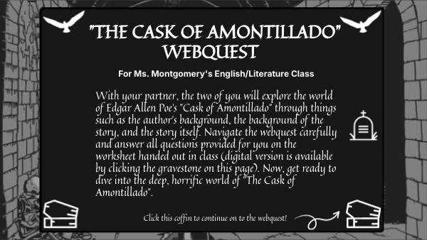 With your partner, the two of you will explore the world of Edgar Allen Poe's "Cask of Amontillado" through things such as the author's background, the background of the story, and the story itself. Navigate the webquest carefully and answer all questions provided for you on the worksheet handed out in class (digital version is available by clicking the gravestone on this page). Now, get ready to dive into the deep, horrific world of "The Cask of Amontillado".
