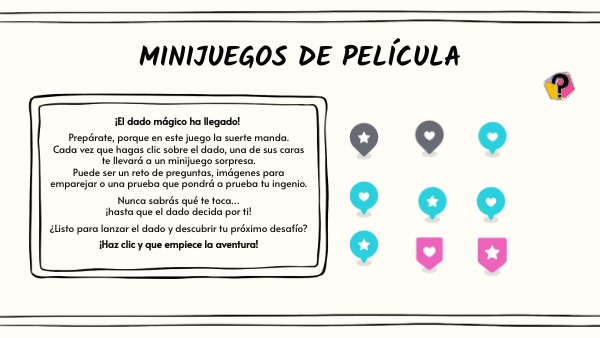 ¡El dado mágico ha llegado! Prepárate, porque en este juego la suerte manda.Cada vez que hagas clic sobre el dado, una de sus caras te llevará a un minijuego sorpresa.Puede ser un reto de preguntas, imágenes para emparejar o una prueba que pondrá a prueba tu ingenio. Nunca sabrás qué te toca…¡hasta que el dado decida por ti! ¿Listo para lanzar el dado y descubrir tu próximo desafío? ¡Haz clic y que empiece la aventura!