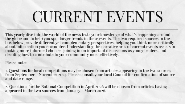 This yearly dive into the world of the news tests your knowledge of what’s happening around the globe and to help you spot larger trends in these events. The two required sources in the box below provide different yet complementary perspectives, helping you think more critically about information you encounter. Understanding the narrative arcs of current events assists in making more informed choices, joining in on important discussions as young leaders, and deciding how to contribute to your community most effectively. Please note: 1. Questions for local competitions may be chosen from articles appearing in the two sources from September – November 2025. Please consult your local Council for confirmation of source and date range. 2. Questions for the National Competition in April 2026 will be chosen from articles having appeared in the two sources from January – March 2026.