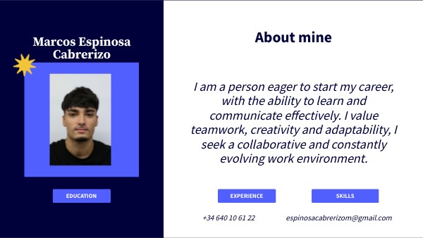 I am a person eager to start my career, with the ability to learn and communicate effectively. I value teamwork, creativity and adaptability, I seek a collaborative and constantly evolving work environment.