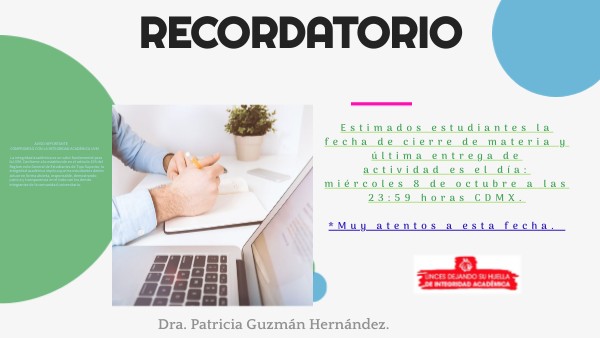 Estimados estudiantes la fecha de cierre de materia y última entrega de actividad es el día: miércoles 8 de octubre a las 23:59 horas CDMX.*Muy atentos a esta fecha.