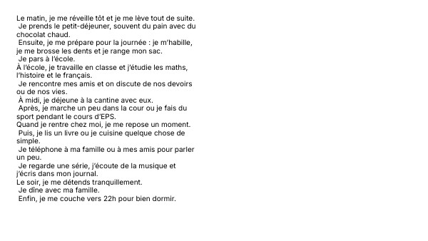 Le matin, je me réveille tôt et je me lève tout de suite. Je prends le petit-déjeuner, souvent du pain avec du chocolat chaud. Ensuite, je me prépare pour la journée : je m’habille, je me brosse les dents et je range mon sac. Je pars à l’école. À l’école, je travaille en classe et j’étudie les maths, l’histoire et le français. Je rencontre mes amis et on discute de nos devoirs ou de nos vies. À midi, je déjeune à la cantine avec eux. Après, je marche un peu dans la cour ou je fais du sport pendant le cours d’EPS. Quand je rentre chez moi, je me repose un moment. Puis, je lis un livre ou je cuisine quelque chose de simple. Je téléphone à ma famille ou à mes amis pour parler un peu. Je regarde une série, j’écoute de la musique et j’écris dans mon journal. Le soir, je me détends tranquillement. Je dîne avec ma famille. Enfin, je me couche vers 22h pour bien dormir.